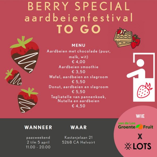 LOTS en van de Loo Groente & Fruit houden van 2 t/m 5 april een aardbeien festival op de stoep voor de winkel van de groenteboer. Samen verkopen ze daar heerlijke aardbeien. Niet zomaar aardbeien, maar aardbeien met chocolade, wafel aardbeien met slagroom, aardbeien Smoothie en nog veel meer. Kom en geniet van deze heerlijke zomerkoninkjes. Ze zijn er weer volop.