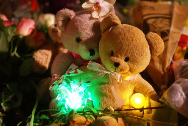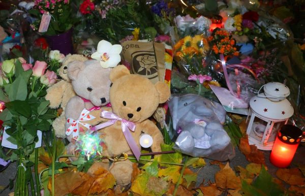 De immense hoeveel bloemen, kaarsjes, lampjes, knuffels en ballonnen bij het Hebehuis in Vught. Bij de gedenkplek voor Sanne en Hebe aan de van Voort tot Voorstraat bij Hebe Huis in Vught liggen inmiddels honderden bossen bloemen.