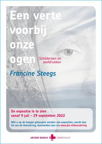 Francine Steegs combineert schilderkunst met fotografische zeefdruk. Een belangrijk thema in haar werk is het tijdloze aspect van de natuur en onze relatie met het verstrijken van de tijd. Haar portretten zijn herinterpretaties van werken uit de kunstgeschiedenis. Het zijn geheimzinnige gezichten, diep in gedachten verzonken, zachtaardig maar ook sterk en ze nodigen uit tot oogcontact. Francine maakt deze personen door haar werk deel van het heden. Tegelijkertijd worden we door deze expositie als kijker meegenomen naar een andere tijd. Ook haar landschappen van lucht, water en bomen lijken verweven met de tijd. Haar werken ademen een sfeer van schoonheid en melancholie.