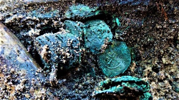 Foto: Zilverschat Maurickplein: een buidel met 158 zilveren munten gevonden in een graf. De munten dateren uit de eerste helft van de twaalfde eeuw.