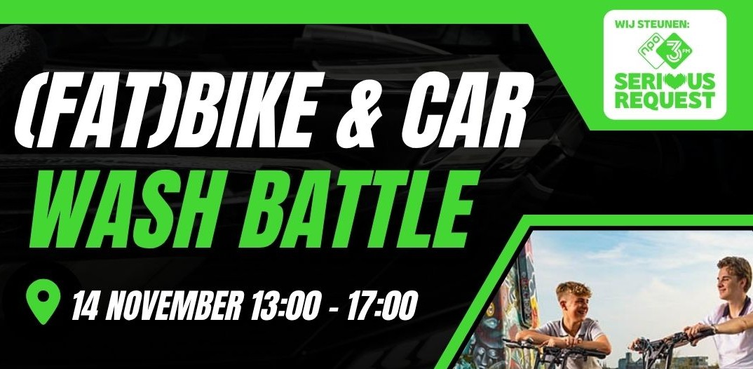 Tussen 13.00 en 17.00 uur kan iedereen bij Jongerencentrum Noord, Zuid-Oost, 4West en Number One terecht om de fiets, fatbike of auto te laten wassen tijdens de (Fat)bike & Car Wash Battle. De volledige opbrengst gaat naar Serious Request – Spieren voor Spieren.