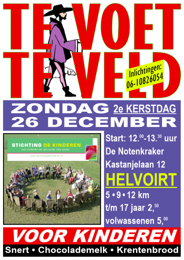 Om de doelstelling te kunnen blijven realiseren is de stichting financieel voor 100% afhankelijk van grote en kleine giften en/of sponsors. Daarom heeft Stichting Te Voet Te Veld, Helvoirt dit jaar gekozen om op zondag 26 december (2e kerstdag) voor Stichting de Kinderen uit Oisterwijk te gaan wandelen. De stichting draait al 12 jaar op vrijwilligers. Later volgt meer informatie, maar als je nu al meer wilt weten waarvoor je gaat wandelen kijk dan op: www.stichtingdekinderen.nl