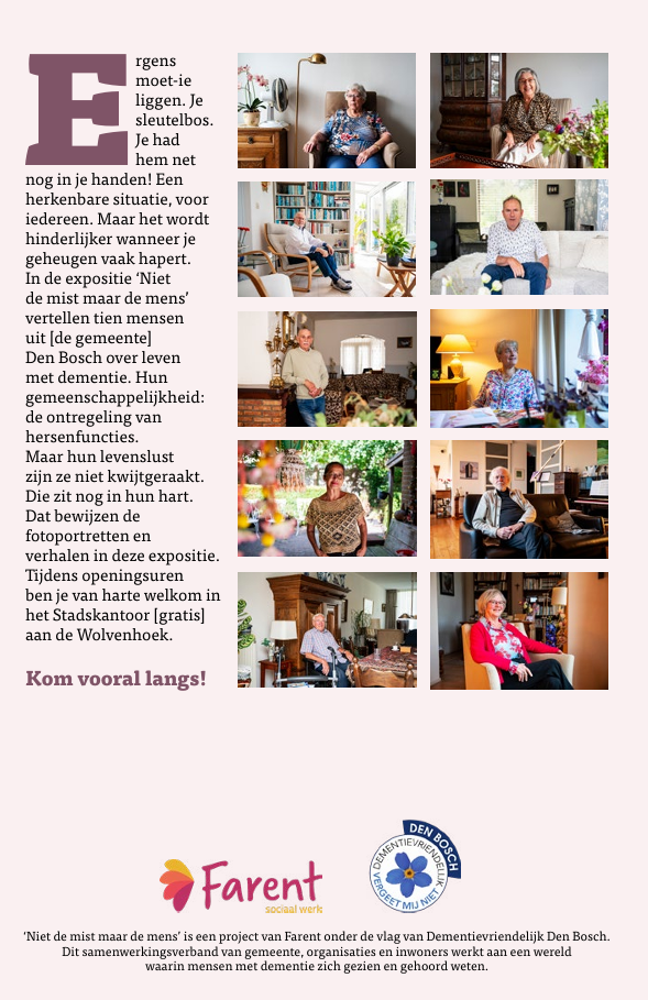 Niet de mist maar de mens is een project van Farent, onder de vlag van Dementievriendelijk Den Bosch. Dit samenwerkingsverband van gemeente, organisaties en inwoners werkt aan een stad waarin mensen met dementie zich gezien en gehoord voelen.