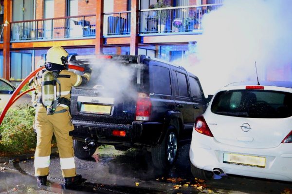 Dat gebeurde aan de Christofoor. De melding van de brand kwam rond de klok van drie uur binnen. Bij aankomst van de brandweer stond een geparkeerde Jeep aan de voorzijde volledig in brand. De brand was inmiddels ook al overgeslagen naar een tweede voertuig wat langs de brandende Jeep geparkeerd stond.