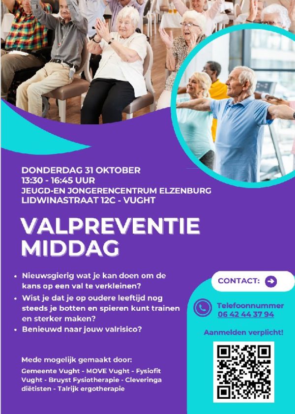 Meer informatie hierover is te vinden op de website www.movevught.nl/valpreventie. Er is plaats voor 60 deelnemers, dus het is raadzaam om u aan te melden. Dit kan via de website, e-mail (info@movevught.nl) of telefonisch via buurtsportcoach Harm (06-4244 3794). Aanmelden kan t/m 24 oktober.