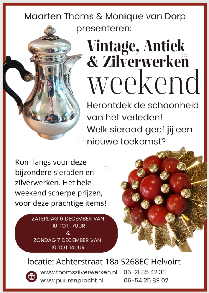 Kom langs voor deze bijzondere sieraden en zilverwerken. Het hele weekend scherpe prijzen, voor deze prachtige items! Achterstraat 18a 5268EC Helvoirt