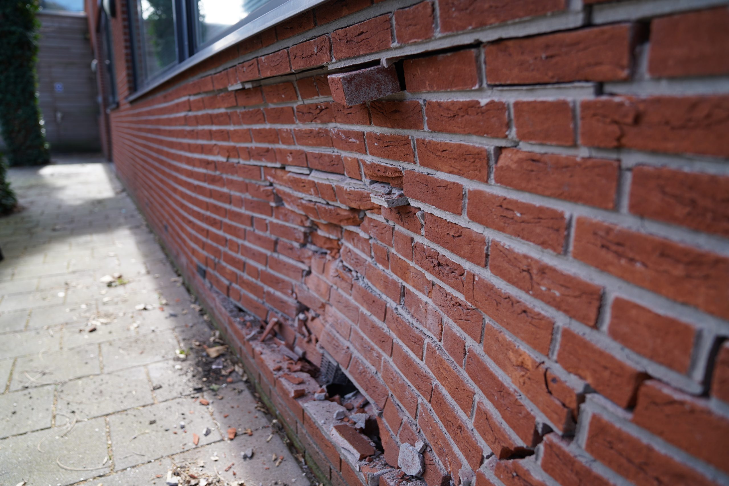 Een deel van de gevel is beschadigd, maar de schade binnen is veel groter. De bakstenen van de gevel zijn verbogen en gebroken. De muur heeft zichtbaar veel schade.
